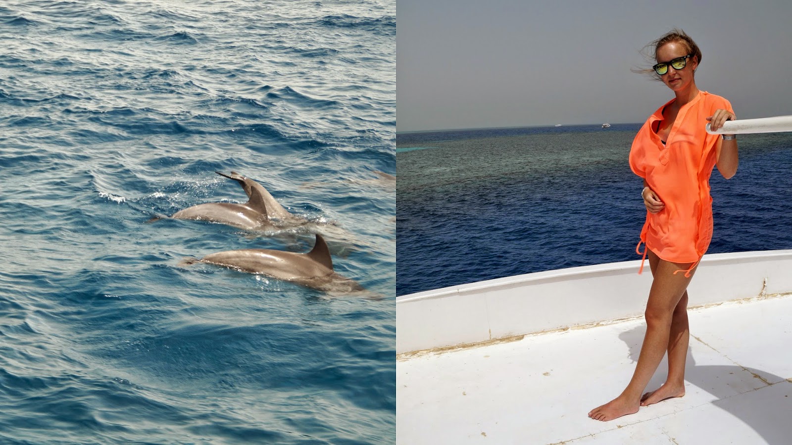 Na een uurtje varen komen we aan bij het eerste rif. Ik ben al vaker in Egypte geweest, maar het valt me eigenlijk nu pas op dat de zee zo enorm helder en blauw is… Wauw.. De bedoeling van vandaag is dat we bij drie verschillende plaatsen op zee stoppen. Je kunt dan met je sexy snorkeloutfit de zee in én dolfijnen spotten. Er is ons zelfs verteld dat je 99% kans hebt om dolfijnen te zien bij deze excursie.. OKE 🙂